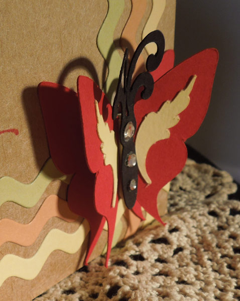 I have to say I didn't think this color scheme really would work at all.  The red didn't seem to fit in but once I put it all together I love it!  I used PTI's Extra large rick rack die in place of the straight strips.  The sentiment is from PTI's Signature Series Dress Form for the sentiment.  I felt I needed some type of focal point to place where the strips cross.  I chose one of the butterflies from my 3-D butterfly file.  I just love how much dimension postioning both parts of the file brings.  Rhinestones on the body of the butterflies finishes up the card.